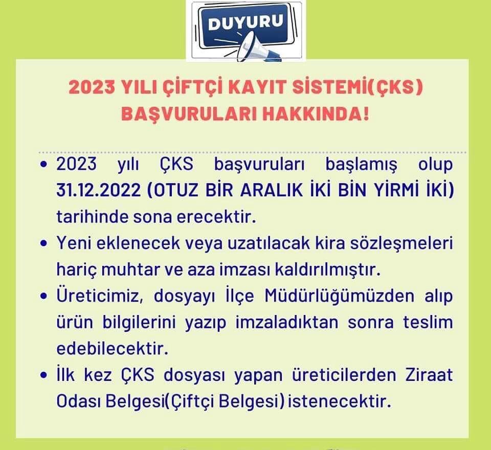 - 2023 ÇKS BAŞVURALARI 31 ARALIK 2022 TARİHİNDE SONA ERECEKTİR.